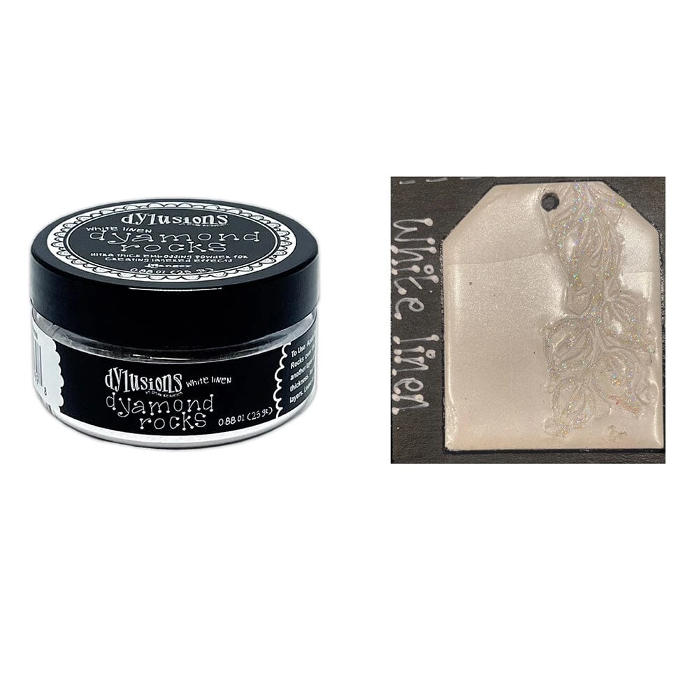 Ultra thick embossing powder for creating layered effects. Add color, dimension, and texture to art journal, mixed media & paper craft projects with Dylusions Dyamond Rocks. For use with Dyamond Dust, Mediums, Boards, Stamps and more. To use: Apply Dyamond Medium to Dyamond Boards. Sprinkle Rocks over the top, tap off excess. Heat to melt. While still hot, add another layer of rocks. Repeat 3 times or to achieve desired thickness. Ink stamp with Dyamond medium and stamp into the hot layers. Leave to cool. Remove stamp and decorate with Dyamond Dust. .88 oz (25gr)