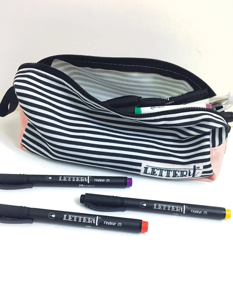 Store all your Letter It™ Medium Pens, Fineliners, Embossing Powders, Perfect Pearls, and more in this stylish new Letter It™ Accessory Bag! Featuring the signature Letter It™ black and white stripes with a subtle pink bottom, this zippered bag makes storing your favorite products super easy. Measuring 8” L x 3.5” W x 2.75” H, the custom designed canvas bag features a zipper and is ideal for storing inks, pens, brushes, and more.