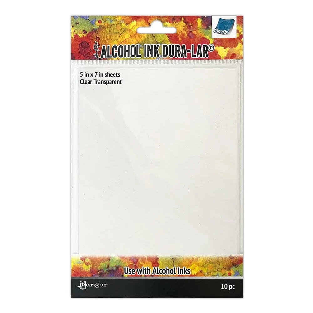 Tim Holtz® Alcohol Ink Dura-Lar® Clear is a versatile surface suited for permanent inks & mixed media techniques. Dura-Lar® Clear is transparent film 0.10″ (110lb cover) surface that is heat tolerant and non-absorbent. Use with Tim Holtz Alcohol Inks, Alcohol Pearls, Alloys, Mixatives, and Blending Solution. Sheets measure 5″ x 7″ (12.7 cm x 17.78 cm). 10 pieces.