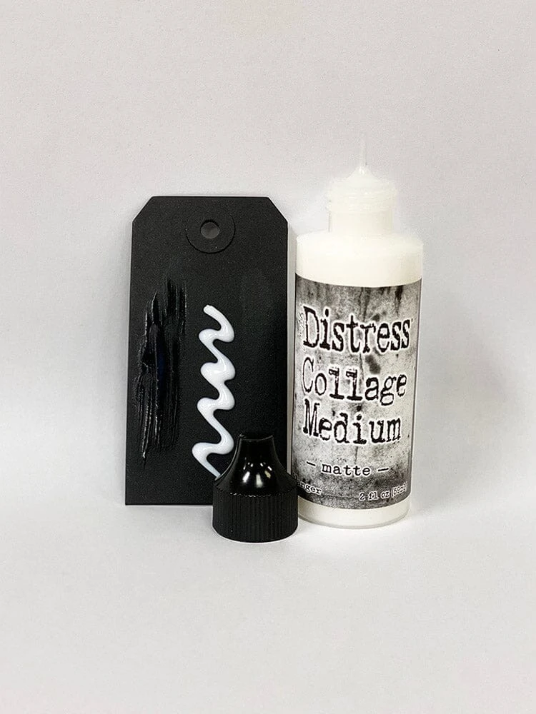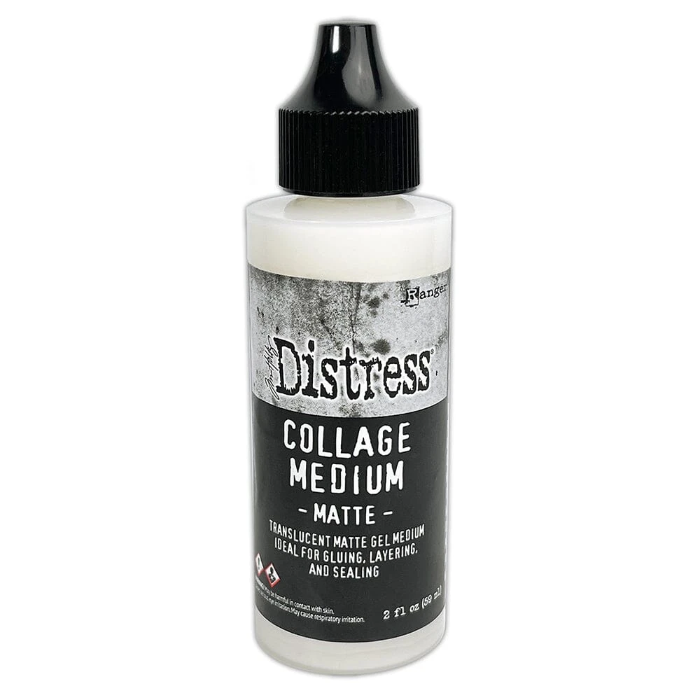 Tim Holtz Distress® Collage Medium is a matte gel medium ideal for gluing, layering, and sealing mixed-media projects. Apply directly on porous or non-porous surfaces including paper, chipboard, wood, fabric, glass, metal and plastic. The applicator tip bottle is designed for applying to smaller elements. Drying time will vary depending on amount applied. Dries translucent with a matte finish. Available in 2 oz bottle.