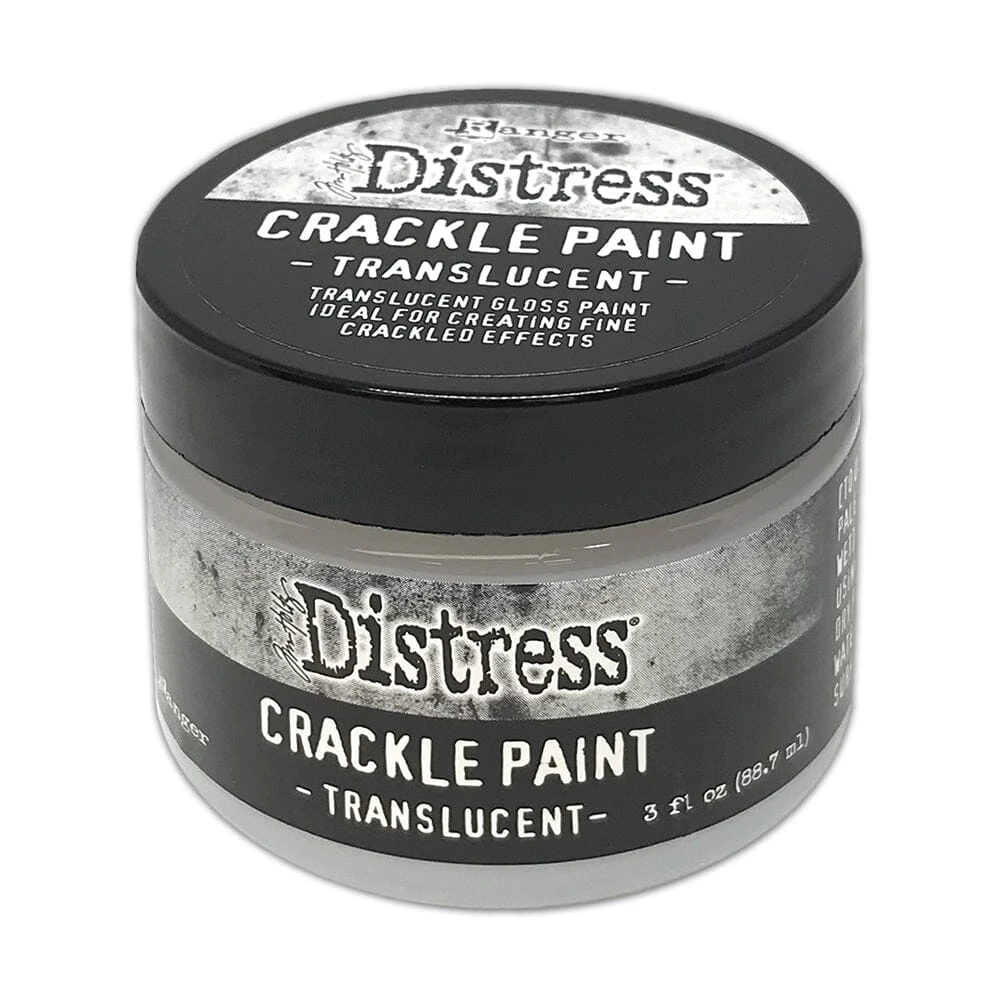 Tim Holtz Distress® Crackle Paint Translucent is a translucent gloss paint ideal for creating fine crackled effects. Crackle Paint can be colorized both while wet or once dried to allow for endless color possibilities. Great for use with Tim Holtz Distress® Palette Knives, brushes, and other tools. Available in 3 fl oz (88.7 mL) jar