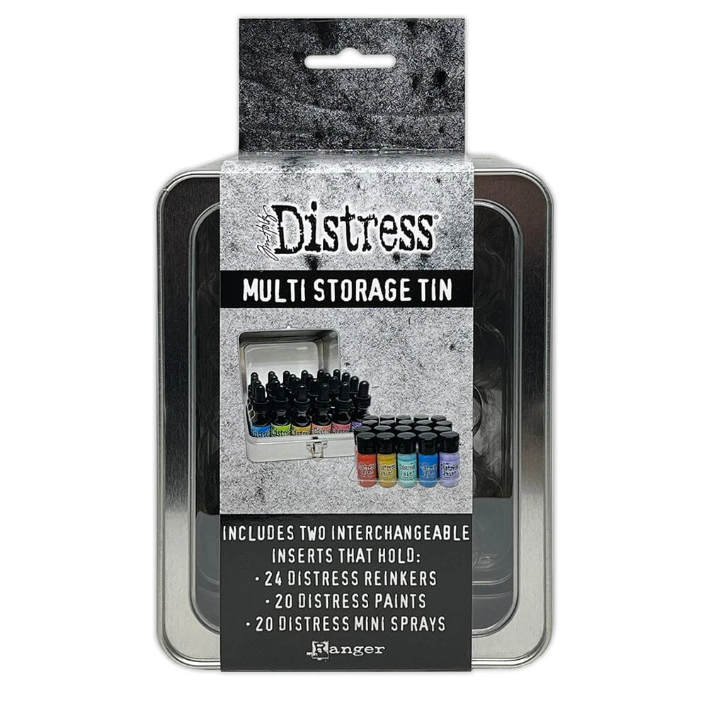 Tim Holtz Distress® Multi Storage Tin is the ideal storage solution for Tim Holtz Distress Reinkers, Paints, and Mini Sprays. Organize and transport easily in this interchangeable stackable tin. Features a clear window and hinged metal closure. Divided, interchangeable inserts make it easy to organize and access individual bottles. Interchangeable inserts hold up to 24 Distress Reinkers, 20 Distress Paints, 20 Distress Mini Sprays. 1 Piece