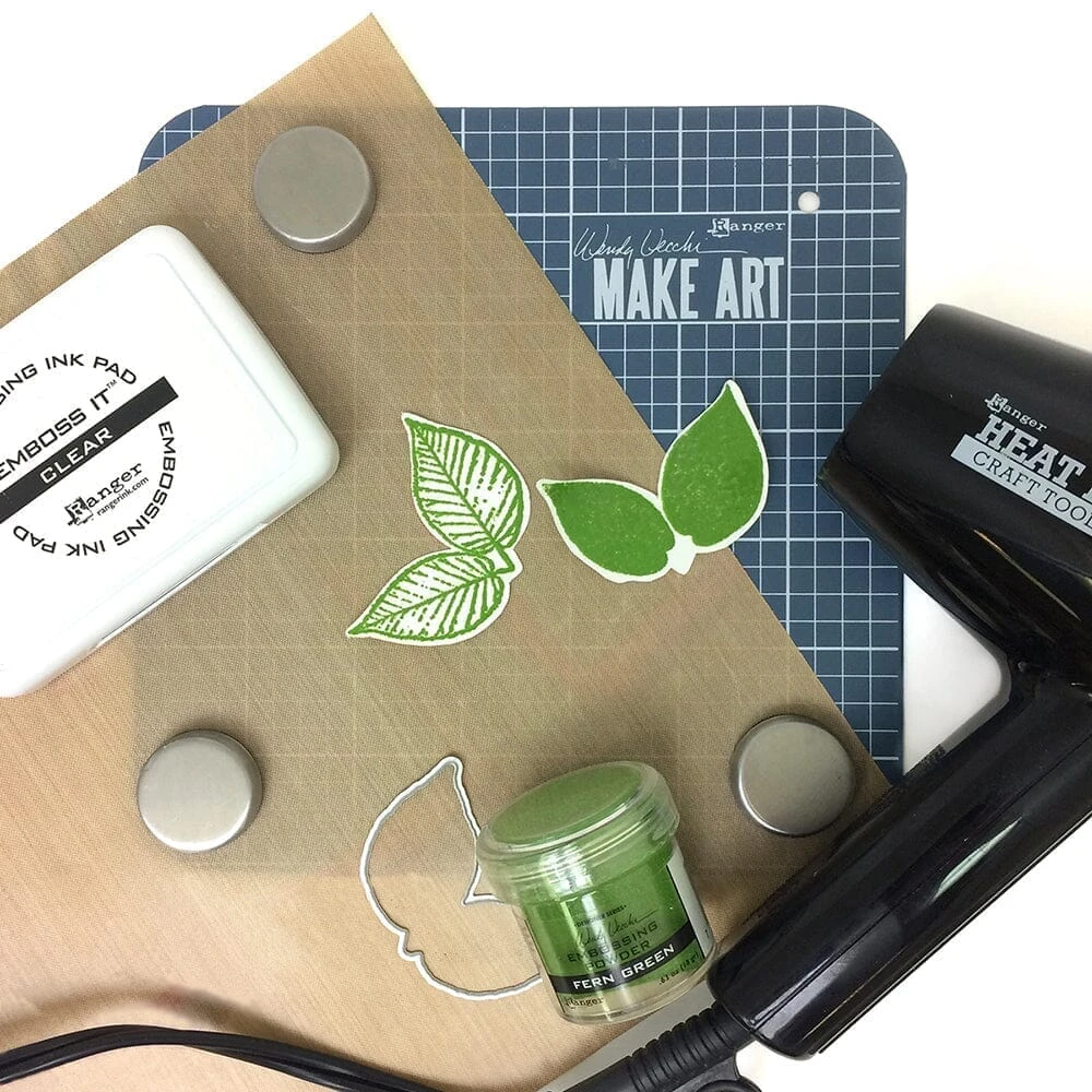When using Permanent and Solvent Inks, Alcohol Ink, acrylic paint, stencil/texture pastes, as well as any medium that has a permanent quality on your project with the MAKE ART Stay-tion, it is recommended to always use a non-stick surface such as Ranger’s Non-Stick Craft Sheet underneath your project. The included magnets can secure it in place without causing damage to the grid surface. The gridlines are visible through the Non-Stick Craft Sheet.